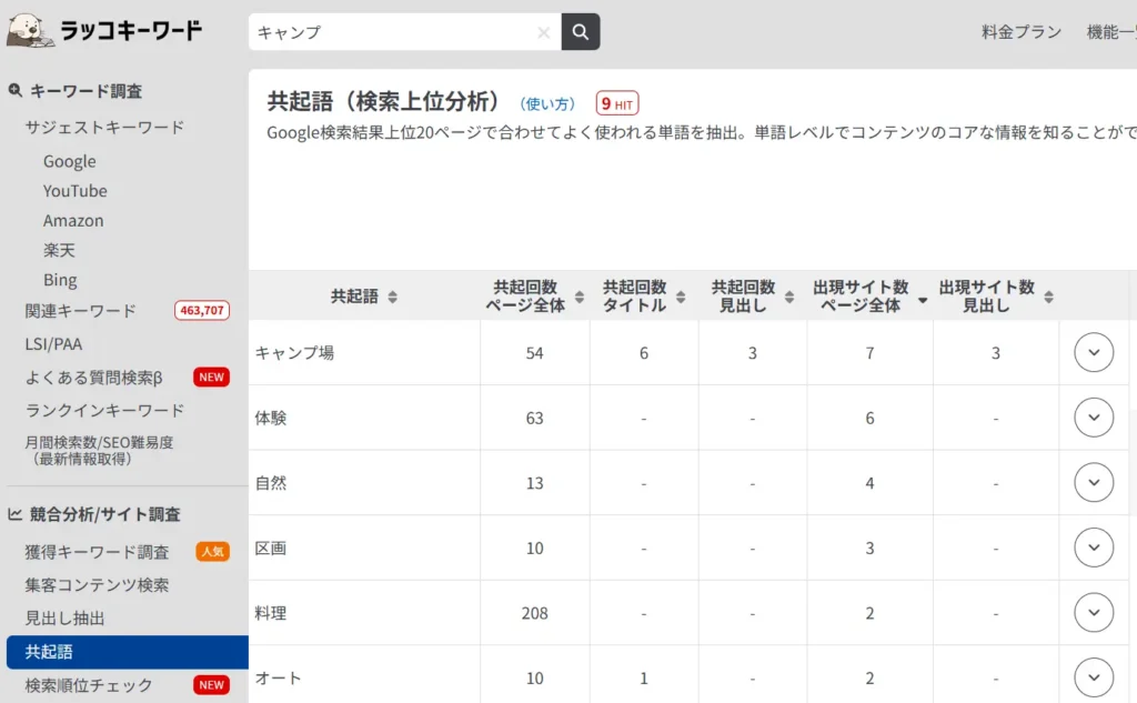 例えば、これは「キャンプ」というキーワードで共起語を抽出した画面です。「キャンプ場」「体験」「自然」「区画」「料理」といった単語が並んでいますね。 これはつまり、「キャンプ」について詳しく書かれた上位の記事には、これらの単語に関連するトピックが含まれていることが多い、ということを示しています。